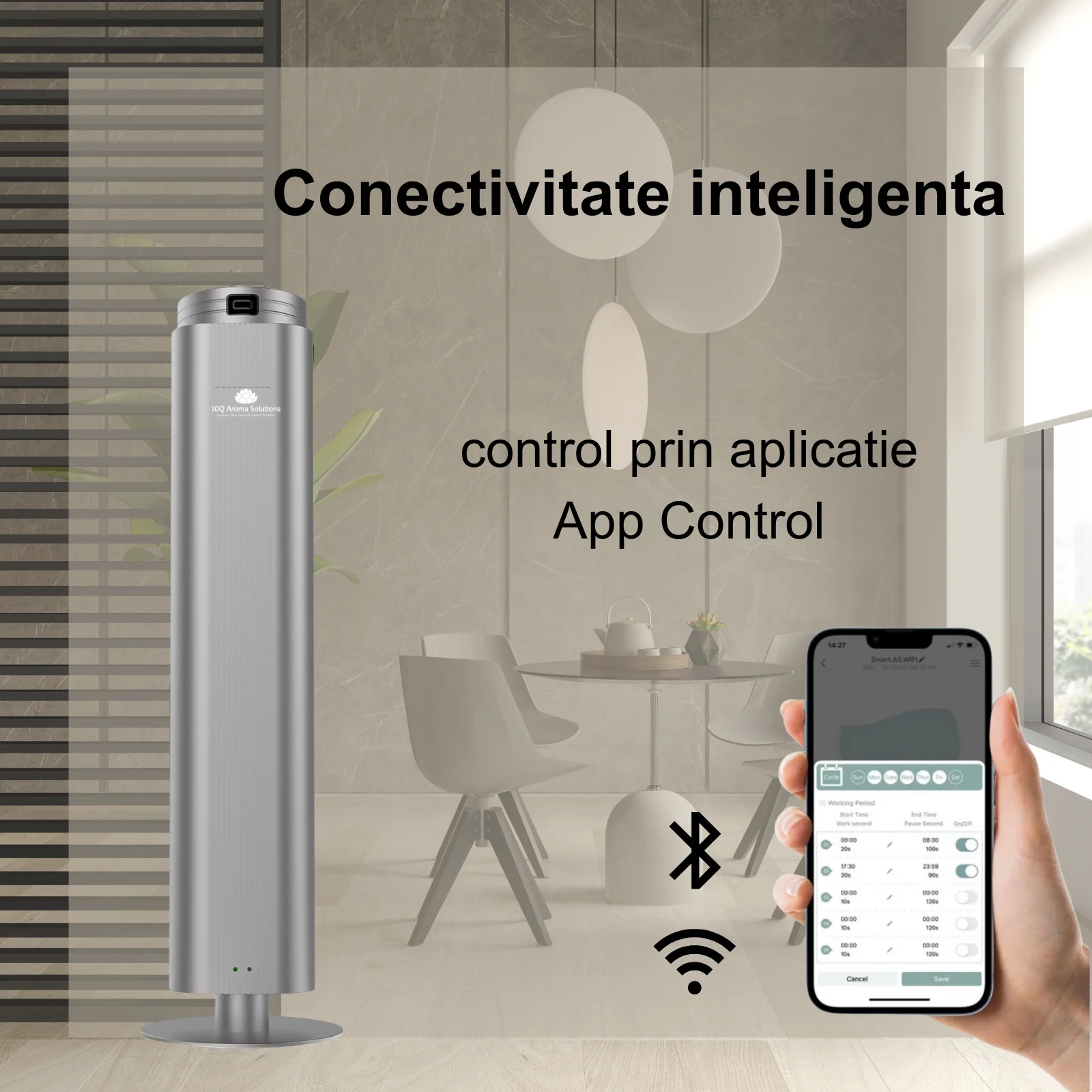 Aparatul poate fi controlat prin Bluetooth si Wi-Fi direct din aplicatia mobila Aroma-Link (disponibila gratuit Android / iOS), permitand programarea exacta a orelor si intensitatii de functionare.