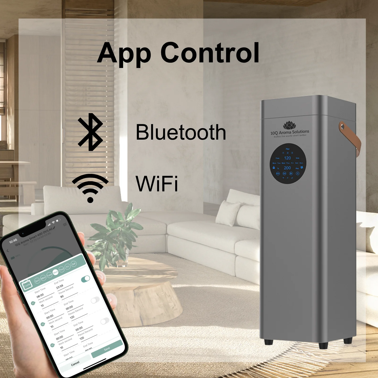 Conectivitatea Bluetooth si Wi-Fi permite setarea orelor si intensitatii parfumarii direct din aplicatia Aroma-Link, oferind flexibilitate totala si economie de timp.