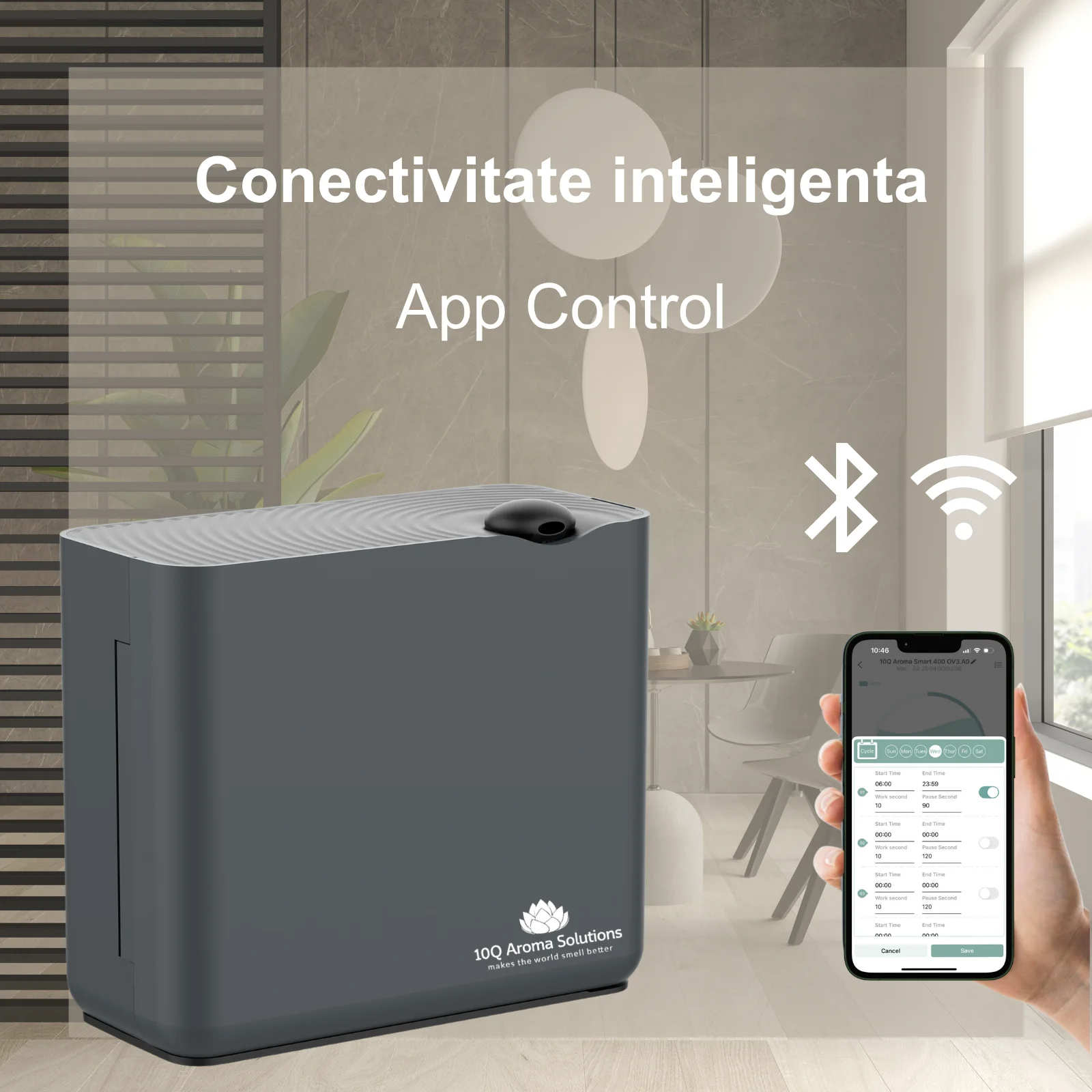Aparatul poate fi controlat prin Bluetooth sau Wi-Fi, direct din aplicatia Aroma-Link (Android si iOS), unde poti programa intensitatea si intervalele orare.