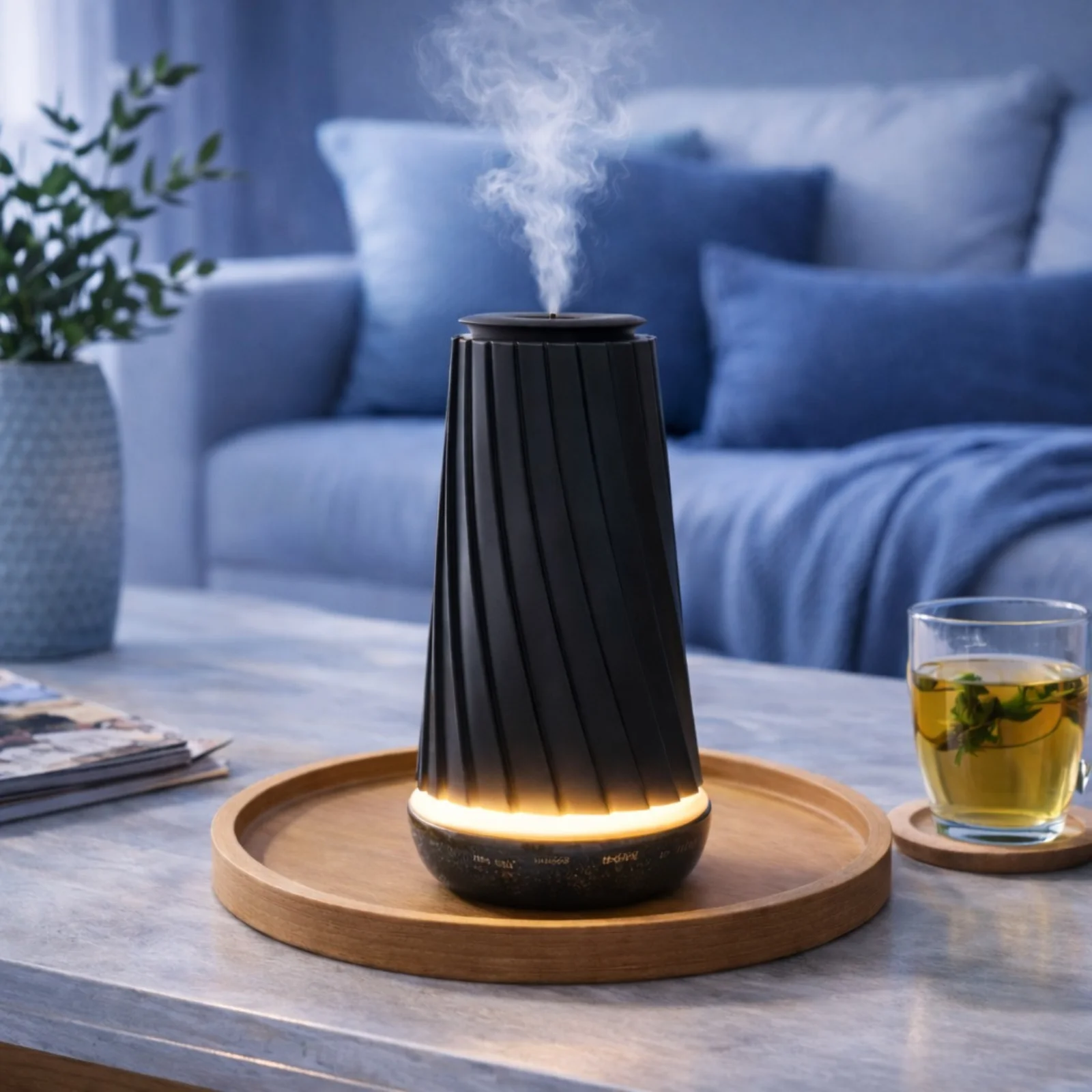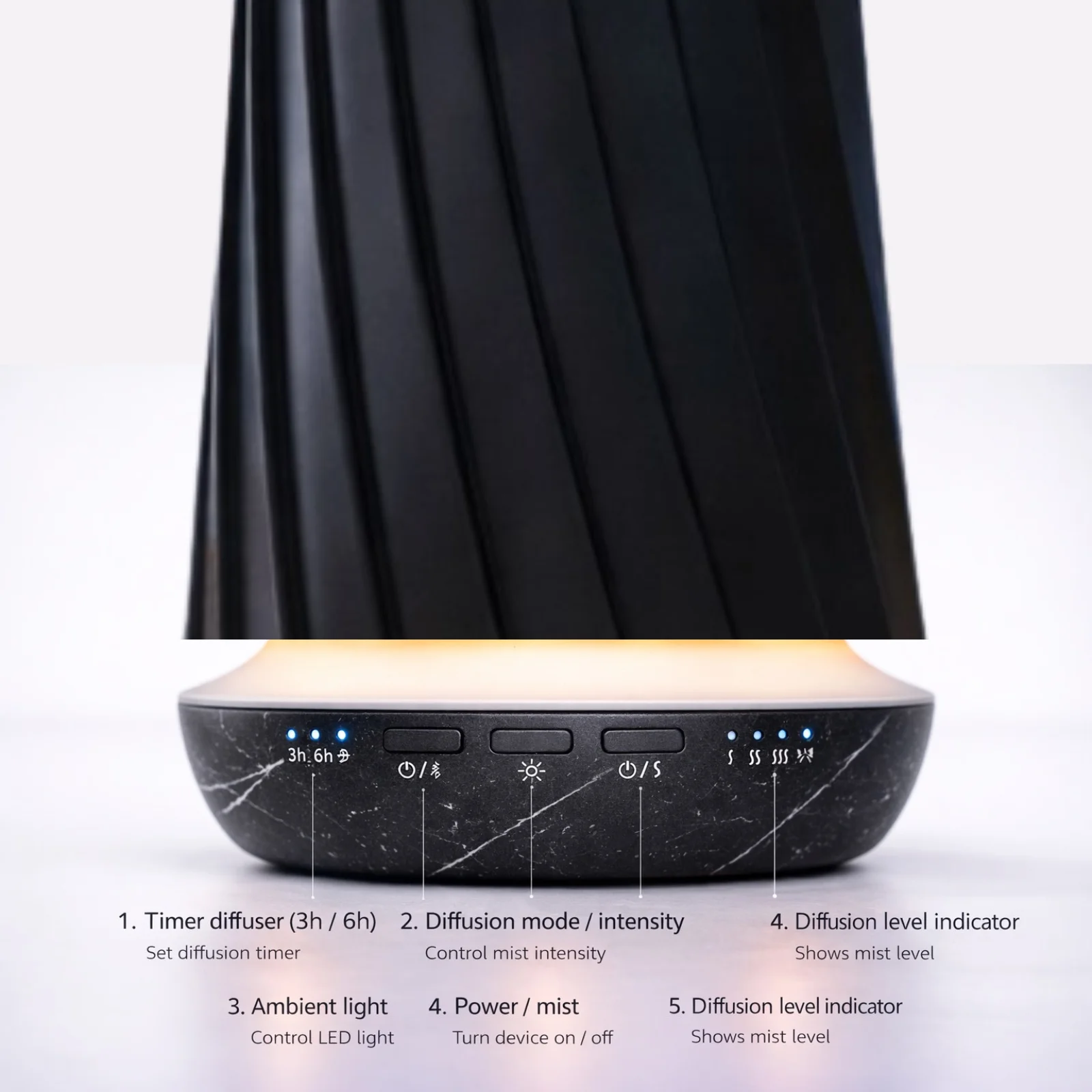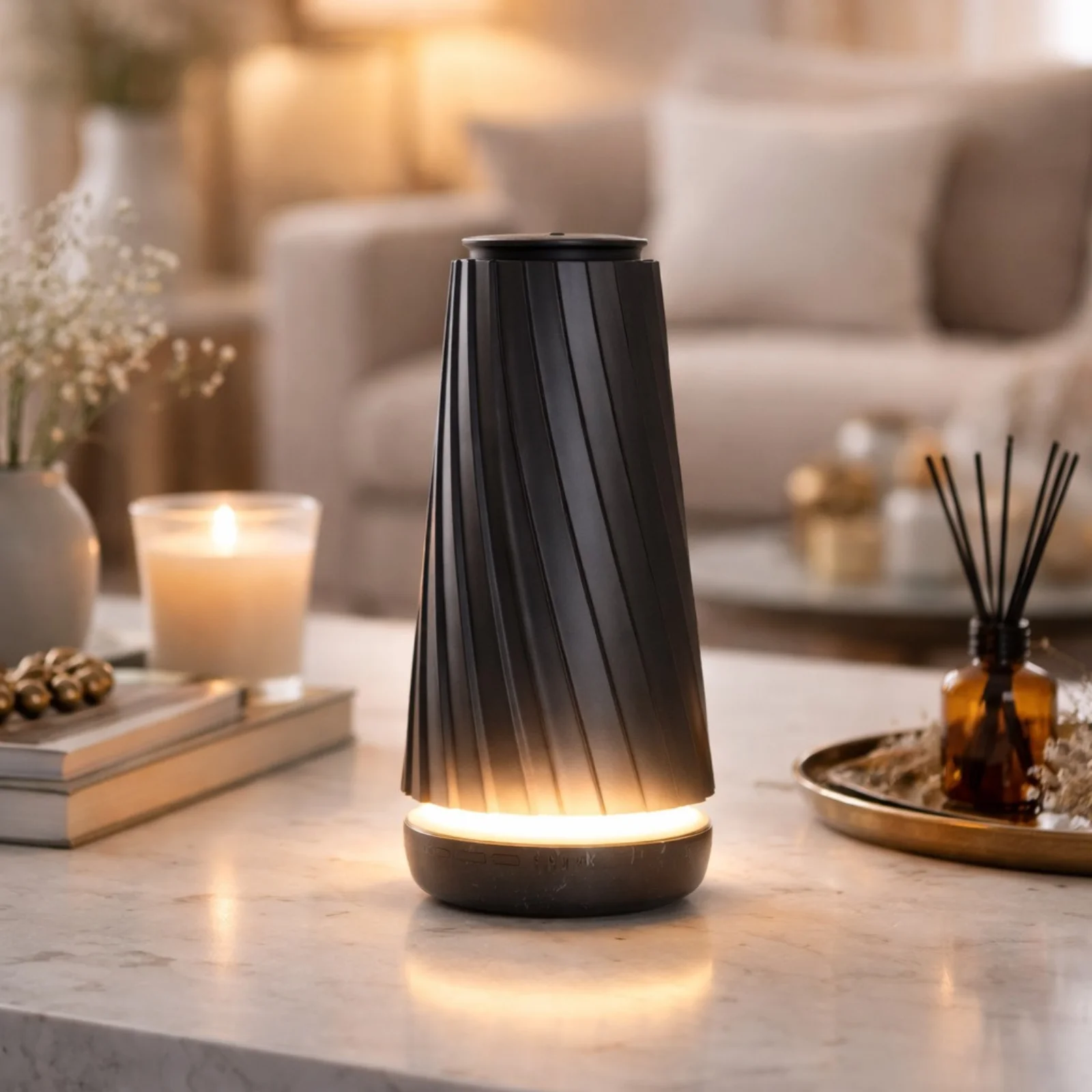 10Q Aroma Vertis Negru combina tehnologia moderna de difuzare a parfumului cu un design minimalist si compact, completat de o lumina ambientala discreta care adauga un plus de confort vizual si rafinament.